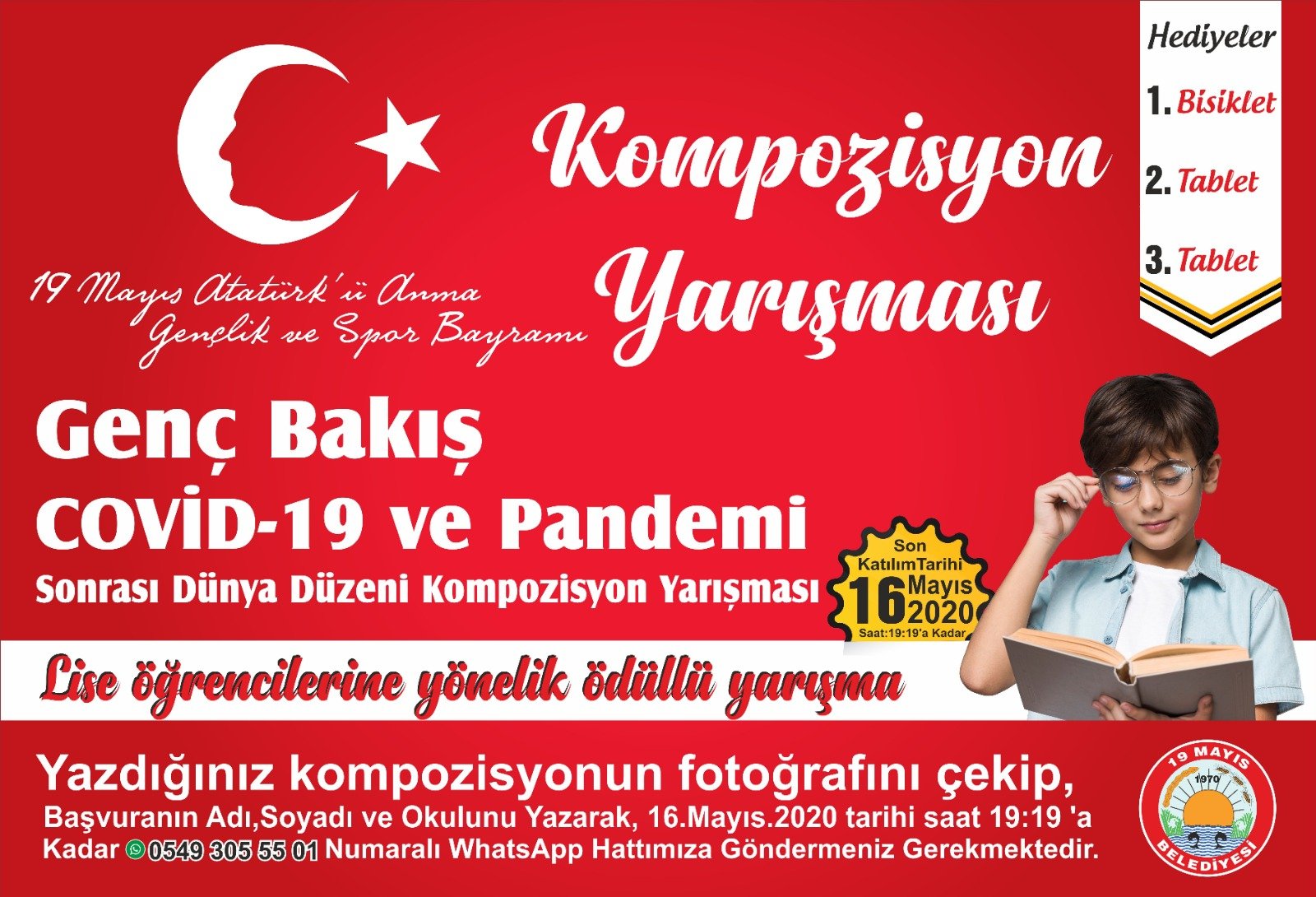19 Mayıs Belediye Başkanı Osman Topaloğlu sosyal medya üzerinden yaptığı paylaşımında, ‘’ Korona virüs tedbirleri kapsamında maalesef 19 Mayıs Atatürk’ü Anma Gençlik ve Spor Bayramını da evlerimizde kutlayacağız.23 Nisan Ulusal Egemenlik ve Çocuk Bayramında ilkokul ve ortaokul öğrencilerimiz için bir yarışma düzenlemiş, öğrencilerimizi sürpriz hediyeler ile buluşturmuştuk. Sıra Genç bakışlarda, yani lise öğrencilerimizde. Onlar için düzenlediğimiz Genç Bakış Covid-19 ve Pandemi Sonrası Dünya Düzeni Komposizyon yarışmamız var. Haydi, gençler yazdığınız komposizyonun fotoğrafını çekin ve bize gönderin” Dedi.