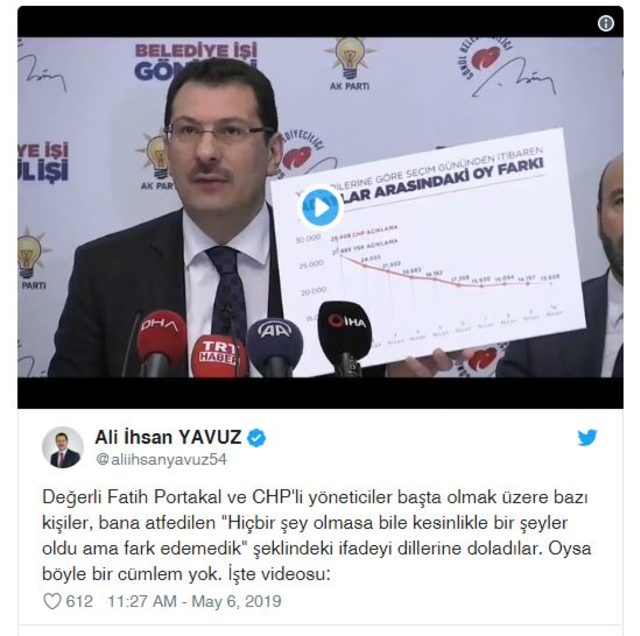 Ali İhsan Yavuz sosyal medya platformu Twitter üzerinden, "'Hiçbir şey olmasa bile kesinlikle bir şeyler oldu ama fark edemedik' şeklindeki ifadeyi dillerine doladılar. Oysa böyle bir cümlem yok" paylaşımında bulundu.Yavuz, İstanbul seçimlerine yönelik itirazlar hakkında yaptığı bir konuşmanın gazeteci Fatih Portakal ve CHP'li isimler tarafından çarpıtıldığını belirtti.