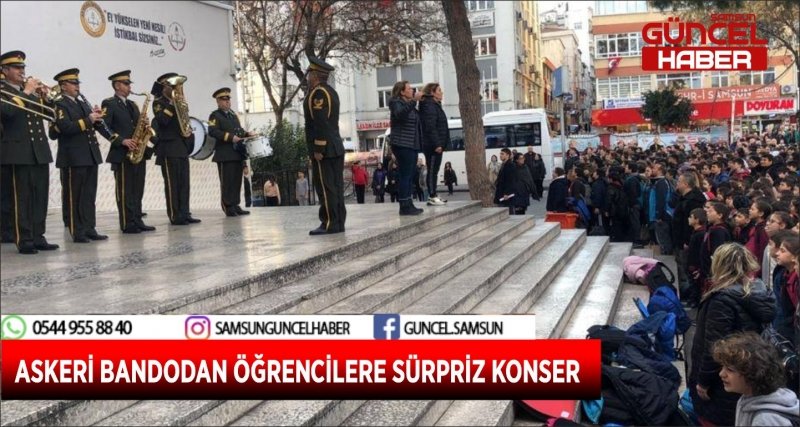 Samsun Sahra Sıhhiye Okulu ve Eğitim Merkezi Bölge Bando Komutanlığı Bando Ekibi tarafından 23 Nisan Ortaokulu öğrencilerine okul bahçesinde sürpriz bir konser verildi. Her cuma günü çalan son zille İstiklal Marşı okuyup evlerine dağılan öğrenciler bu kez karşılarında askeri bando ekibini buldu.