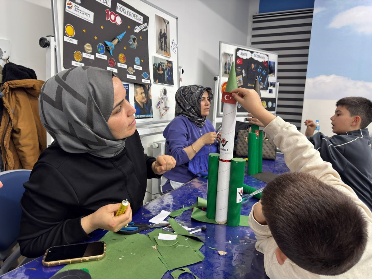 eğlendi. Geri dönüştürülebilir malzemelerden model roket tasarımı gerçekleştiren aileler,