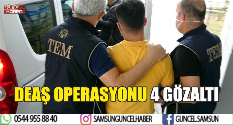 Edinilen bilgiye göre, Samsun Emniyet Müdürlüğü Terörle Mücadele (TEM) Şube Müdürlüğü ekipleri, Irak'ta bulundukları dönemde DEAŞ silahlı terör örgütü içinde faaliyetleri tespit edilen 4 kişinin Samsun'da oldukları bilgisini aldı. TEM Şube Müdürlüğü ekipleri tarafından saat 06.00 sıralarında İlkadım ve Tekkeköy ilçelerinde bulunan 4 ayrı adrese eş zamanlı operasyon düzenlendi. Operasyonda İlkadım ilçesinde 3, Tekkeköy ilçesinde ise 1 Irak uyruklu DEAŞ şüphelisi yakalanarak gözaltına alındı. Operasyon kapsamında evlerde yapılan aramada dijital envanterlere incelenmek üzere el konuldu. Gözaltına alınan 4 kişi Samsun Eğitim ve Araştırma Hastanesinden sağlık raporu alındıktan sonra sorgulanmak üzere Samsun Emniyet Müdürlüğü Terörle Mücadele Şube Müdürlüğüne götürüldü. Olayla ilgili soruşturma devam ediyor.