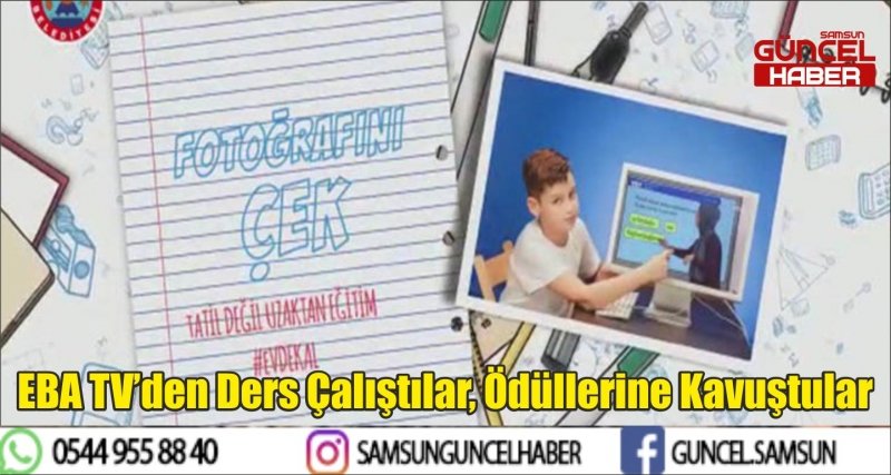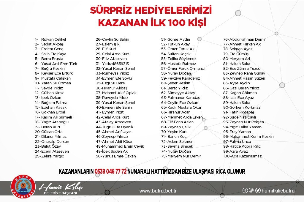 Bu kapsamda EBA TV’de ders izlerken çekilmiş fotoğraflarını Başkan Kılıç’ın, sosyal medya hesabına gönderen evde kal Bafra etiketiyle gönderen ilk yüz öğrenci sürpriz hediyelerin sahibi oldu. 5 Nisan Pazar günü başlatılan kampanya ve 7 Nisan Salı günü saat 21.00’e kadar devam etti. Ödül kazanan öğrenciler Bafra Belediye Başkanı Hamit Kılıç tarafından sosyal medyada yayınlandı.