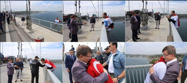 15 Temmuz Şehitler Köprüsü'nde intihar etmek isteyen AK Parti logolu tişört giyen ve Türk bayrağına sarınan Duran Yıldırım'ı eski Başbakan Ahmet Davutoğlu ikna ederek kurtardı.