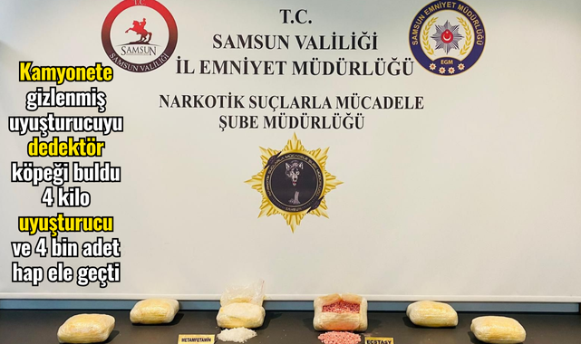 Samsun'da kamyonete gizlenmiş uyuşturucuyu narkotik dedektör köpeği Şila bulurken, 4 kilo 975 gram metamfetamin ve 4 bin 840 adet extacy hap ele geçirildi.