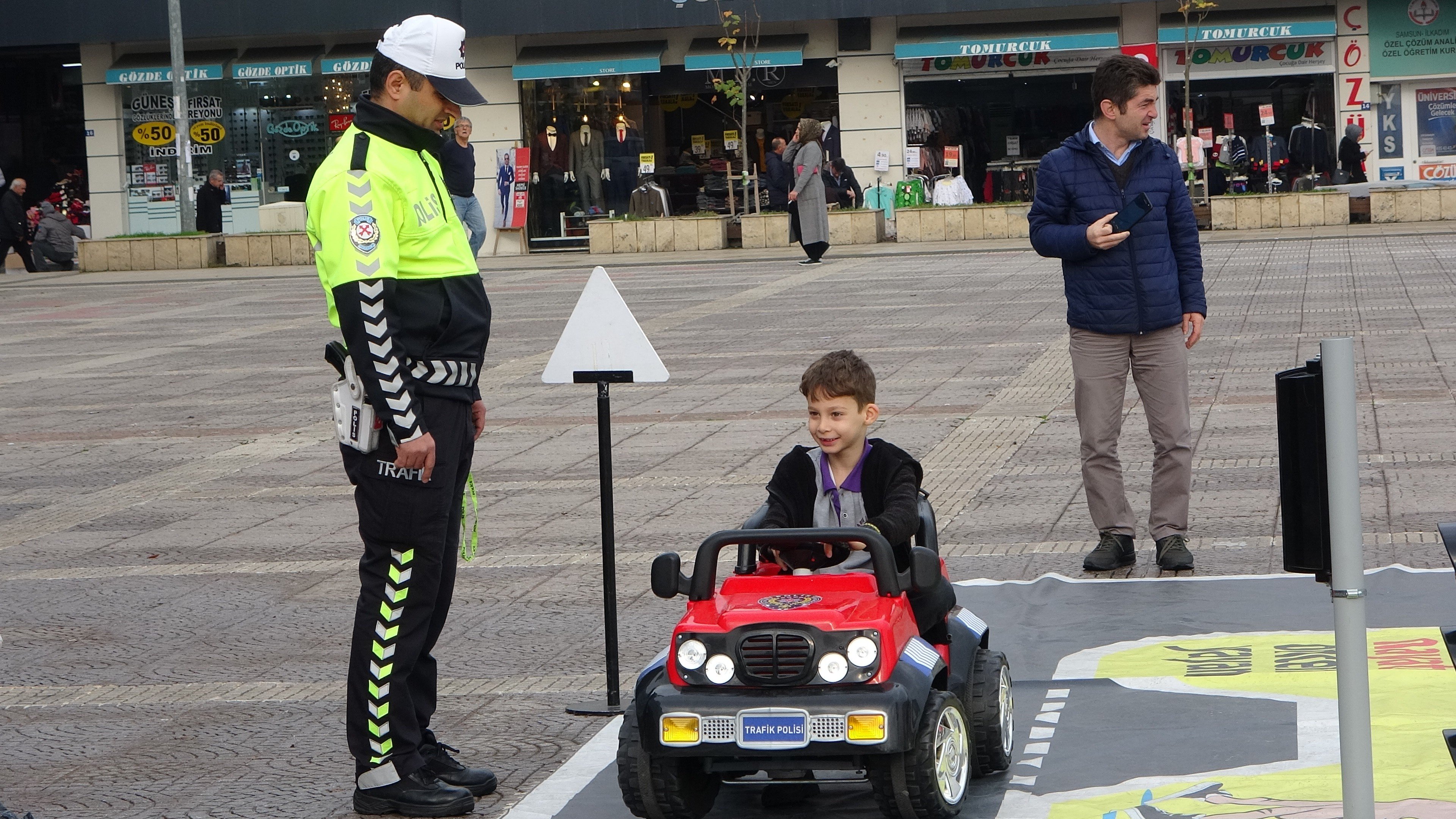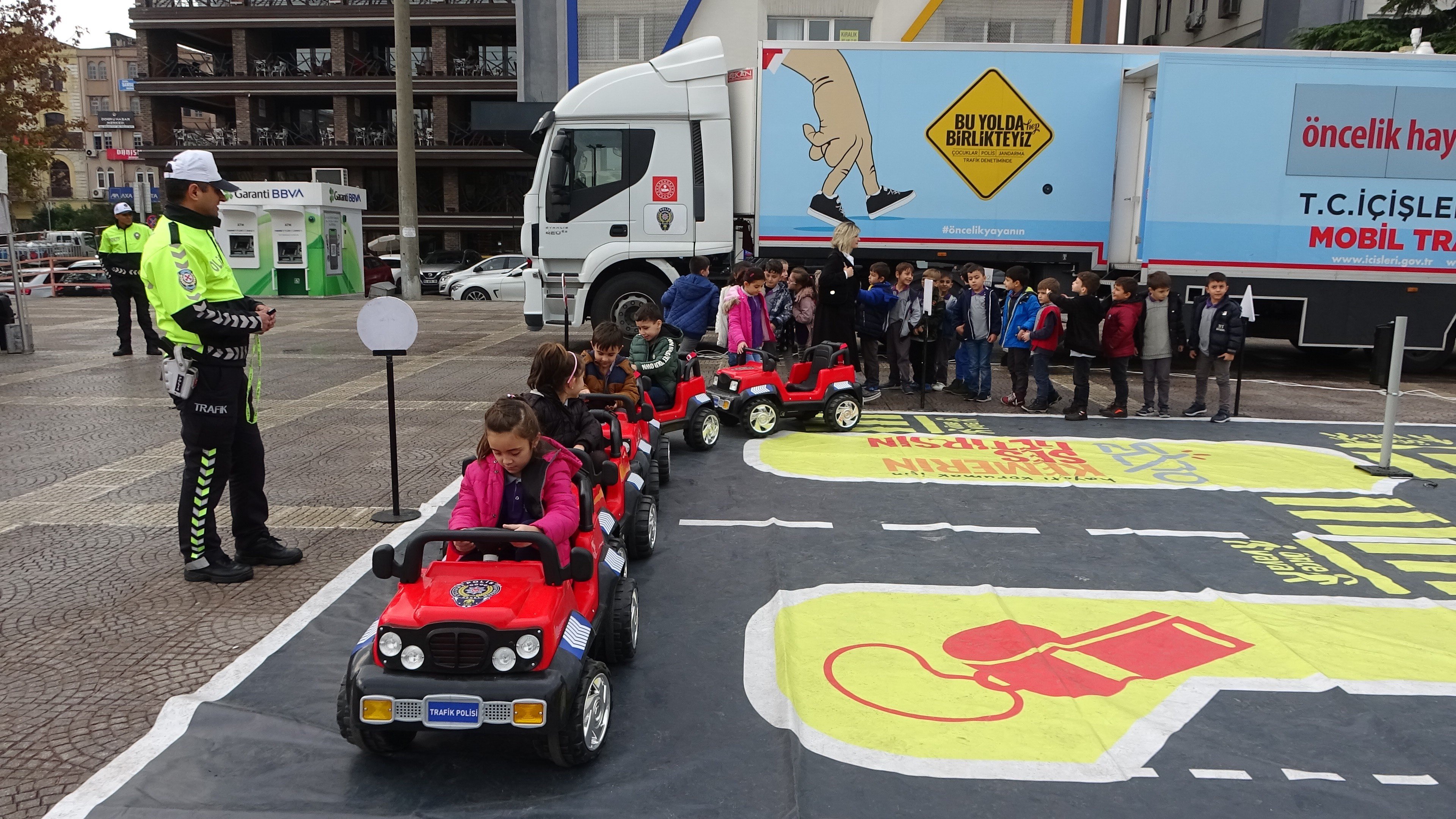 Kente gelen trafik eğitim tırı, Cumhuriyet Meydanı’na konuşlandı ve öğrencilere tırın içinde hazırlanan mobil sınıfta, trafik eğitimi verildi. Trafik kurallarına ilişkin özel olarak hazırlanan videoları da izleyen öğrenciler, trafikle ilgili eğitimler aldı. ‘Trafik Dedektifi’ olmaya aday öğrenciler müzik eşliğinde özel trafik dansını sergiledi. Öğrenciler daha sonra meydana kurulan özel parkurda pedallı araç kullandı. Mobil tır içerisinde öğrendikleri trafik kurallarının teorik bilgilerini pratiğe döken öğrenciler oldukça mutluydu. Polis memurları öğrencilere yaptıkları hataları anında ve olay yerinde söyleyerek onların bilinçlenmesini sağladı.