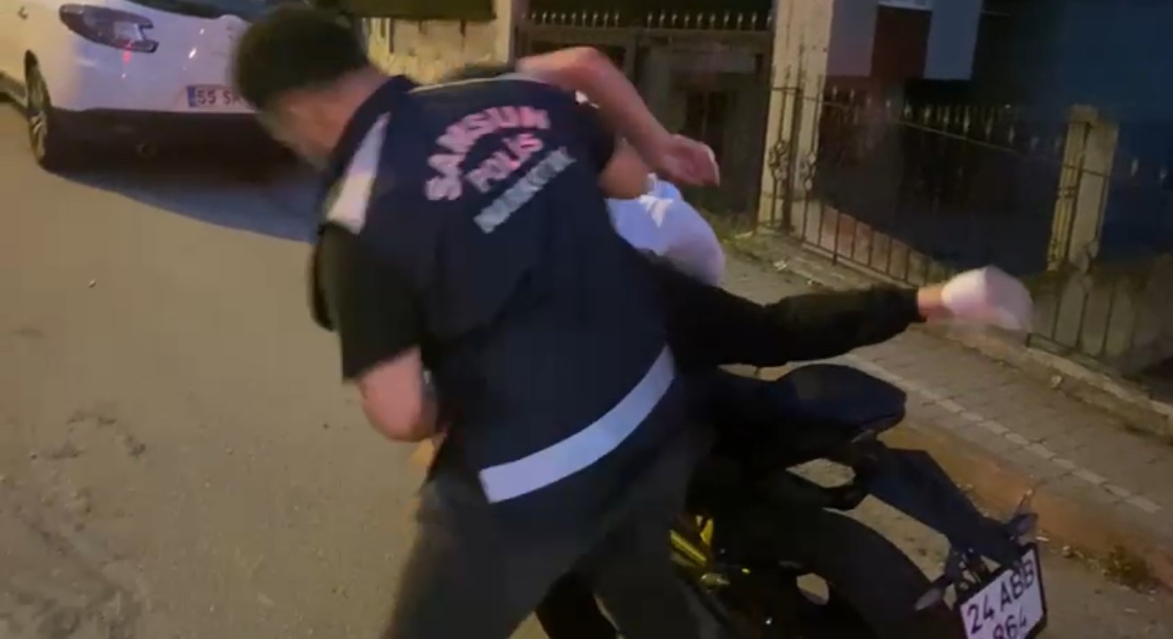 Edinilen bilgilere göre, Samsun İl Emniyet Müdürlüğü Narkotik Suçlarla Mücadele Şube Müdürlüğü ekipleri, uyuşturucu ticaretini önlemeye yönelik yürüttükleri çalışmalar kapsamında Canik ilçesinde geniş çaplı bir operasyon düzenledi. Narkotik polisi, 16 yaşındaki H.H.E.’yi takibe aldı. Şüphelinin, 20 yaşındaki K.K.’ye çarşafa sarılı paket teslim ettiği belirlendi. Motosikletle ayrılan K.K., kısa süre sonra kovalamaca sonucu yakalandı. Polisin motosiklet üzerindeki şüphelinin üzerine atlayarak etkisiz hale getirdiği anlar polis kamerası tarafından kaydedildi. Çarşaftan çıkan pakette 7 bin 497 adet sentetik ecza hap bulundu.