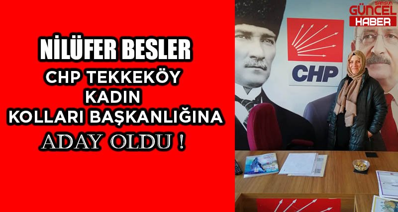 Samsun'a bağlı Tekkeköy ilçesinde Cumhuriyet Halk Partisi (CHP) Kadın Kolları Başkanlığı'nda seçim heyecanı yaşanıyor. İlk defa 2 adayın olduğu başkanlık seçimlerinde adaylardan Nilüfer Besler adaylık sürecinde meşekatlı zor yollarda çeşitli zorluklarla karşılaşsa bile kapı ,kapı gezerek partisinin yerel şeçimlerde yaptığı başarıyı halka anlatacağını ve önce kendi seçimi değil halkın geçimini düşüneceğini, ilk genel seçimlerde başarıya ulaşmak için canla başla çalışacağını ve
