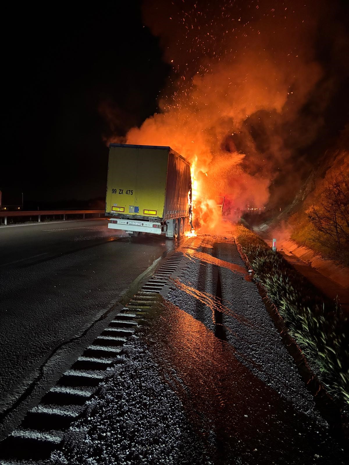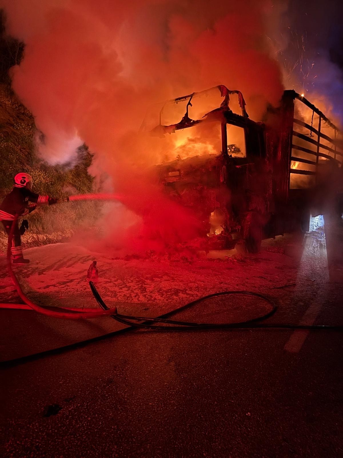 Kısa sürede büyüyen alevler tüm çekiciyi sararken, ihbar üzerine olay yerine gelen itfaiye ekipleri yangına müdahale ederek kontrol altına aldı. Ancak tırın çekicisi tamamen yanarak demir yığınına döndü. Olayda can kaybı ya da yaralanma yaşanmadı.