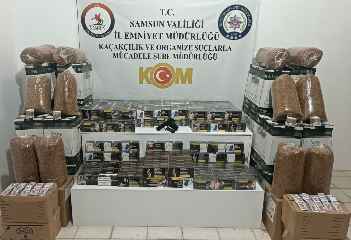 Edinilen bilgiye göre, İl Emniyet Müdürlüğü Kaçakçılık ve Organize Suçlarla Mücadele (KOM) Şube Müdürlüğü ekiplerince kaçakçılıkla mücadele kapsamında Terme ilçesinde bir iş yeri ve depoya operasyon düzenlendi. Yapılan aramalarda, 1 adet ruhsatsız tabanca, 7 adet tabanca fişeği, 70 bin adet gümrük kaçağı makaron, 13 bin 600 adet makaron sigara, 168 bin 750 adet gümrük kaçağı sigara sarma kağıdı ve 285 kilo tütün ele geçirildi. Operasyonda M.E. isimli şahıs yakalanarak gözaltına alındı. Polisteki işlemleri tamamlanan M.E., adliyeye sevk edildi.