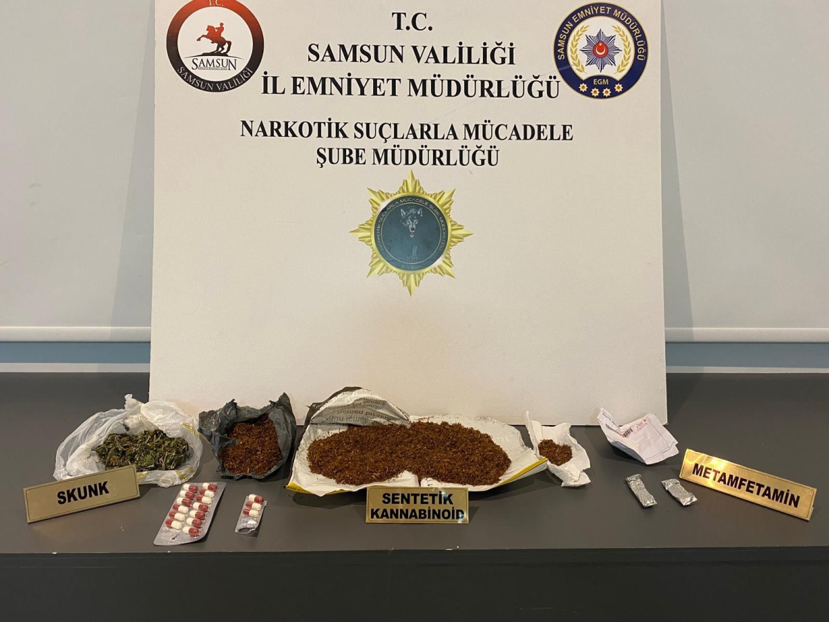 Narkotik ekipleri tarafından İlkadım ilçesinde Ö.Ö.'nün (39) ikametinde yapılan aramada ise 451 gram metamfetamin, 35 gram sentetik kannabinoid hammaddesi, 9,34 gram esrar ve 0,24 gram kokain ele geçirildi. Gözaltına alınan şüpheli bugün Samsun Adliyesi'ne sevk edildi