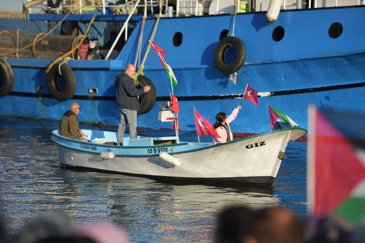 Samsun Limanı açıklarında toplanan balıkçı tekneleri, gezi tekneleri ve çeşitli deniz araçları, Sumud Filosu'na ve Filistin halkına destek vermek amacıyla kortej oluşturdu. Sirenler eşliğinde gezen teknelere karadan vatandaşlarda destek verdi.