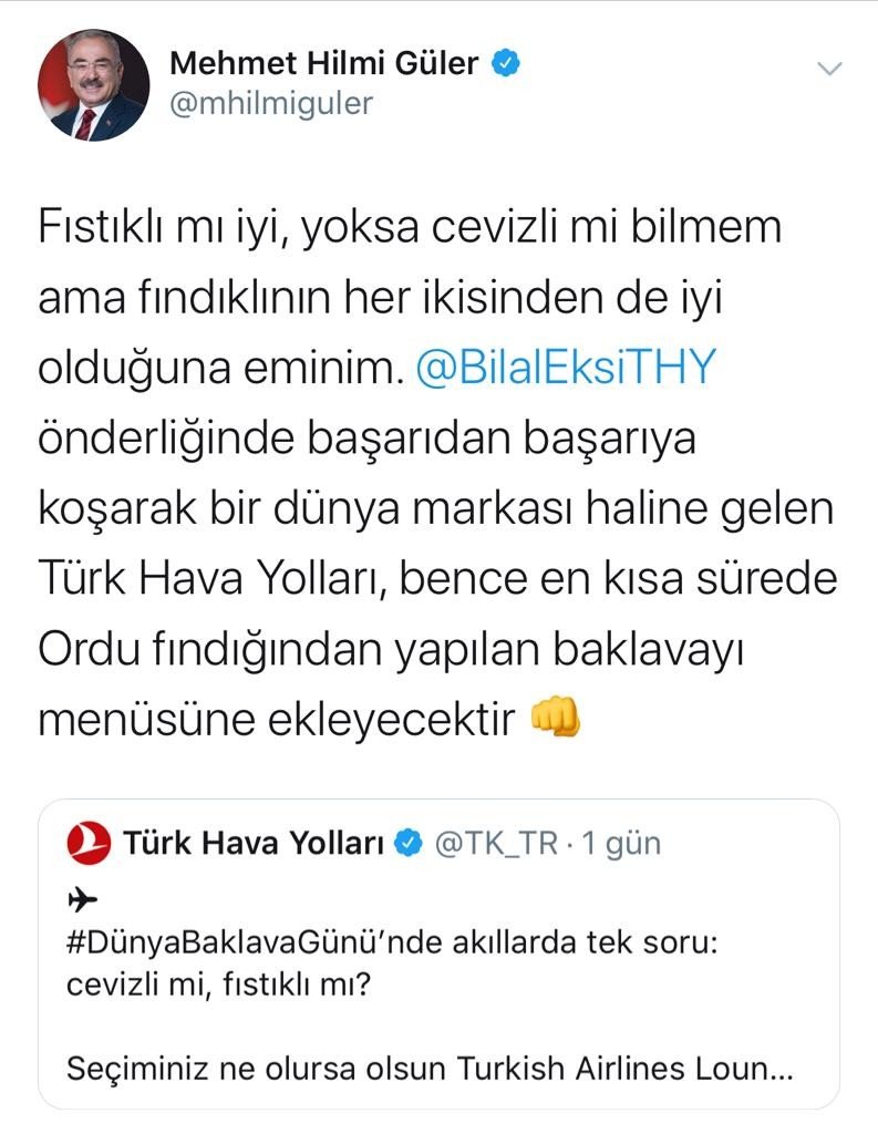 Türk Hava Yolları, 17 Kasım Dünya Baklava Günü dolayısıyla sosyal medya hesabında "Dünya Baklava Günü'nde akıllarda tek soru: cevizli mi, fıstıklı mı? Seçiminiz ne olursa olsun, Turkish Airlines Lounge alanlarında lezzetli baklavalarımız sizi bekliyor” mesajını paylaştı. Bunun üzerine Ordu Büyükşehir Belediye Başkanı Hilmi Güler de THY Genel Müdürü Bilal Ekşi'ye ithafen gönderdiği paylaşımda, "Fıstıklı mı iyi yoksa cevizli mi bilmem, ama fındıklının her ikisinden de iyi olduğuna eminim. Bilal Ekşi önderliğinde başarıdan başarıya koşarak bir Dünya markası haline gelen Türk Hava Yolları, bence en kısa sürede Ordu fındığından yapılan baklavayı menüsüne ekleyecektir" yanıtını verdi.