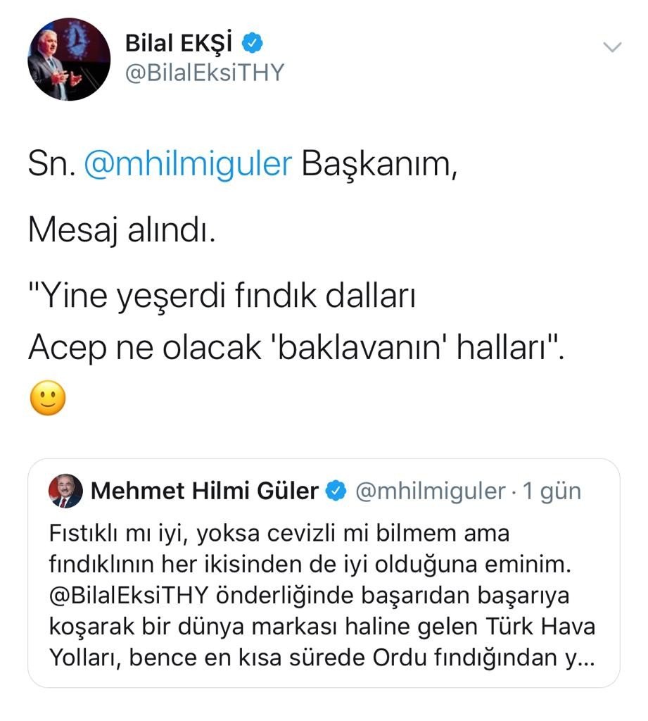 Başkan Güler'in 'Fındıklı Baklava' önerisine sessiz kalmayan THY Genel Müdürü Bilal Ekşi ise Ordu yöresine ait bir türküden esinlenerek, "Sayın Başkanım, mesaj alındı. Yine yeşerdi fındık dalları, acep ne olacak baklavanın halları" diyerek esprili bir dille Başkan Güler’e sosyal medya üzerinden cevap verdi.